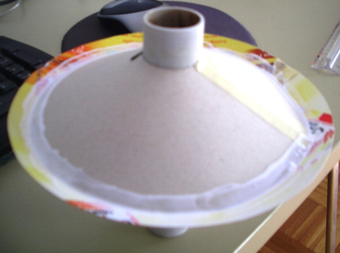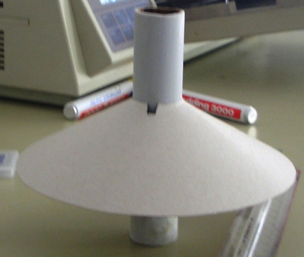 Soweit ich weiß fliegt das Teil allein durch seine Aerodynamik.... Den plan habe ich von http://www.artapplewhite.com unter free stuff, einfach upgescaled. Im TRF habe ich gelesen das ein Ufo immer stabil fliegt wenn der "Trichter"(also alles bis auf das rohr) 3mal so breit ist wie hoch mfg roman