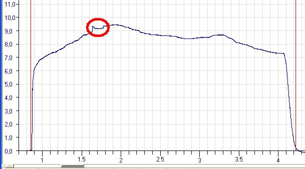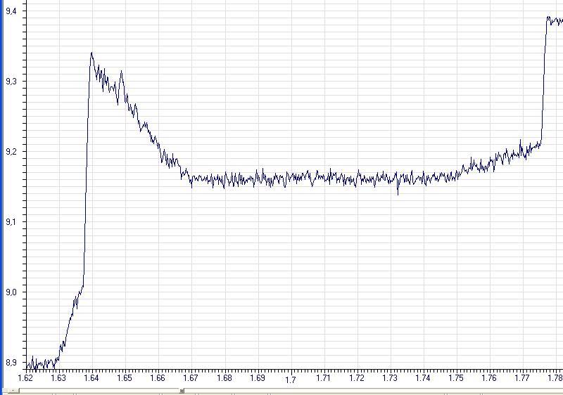 Zitat: Wo Du die 10 Bit hernimmst ist mir unklar. Wie eingangs erwähnt reden wir hier über 12, 14 und 16 Bit. Für den nicht so technischen Mitleser ist das die 4-fache, 16-fache und 64-fache Auflösung. Der von Dir beschriebene Treibstoffblock ist ein heftiger Innenbrenner. Weshalb da eine kleine Blase die relative Ewigkeit von 100ms wirken soll, kann man zumindest anzweifeln. Zitat: Da will ich doch gleich mal ein Beispiel liefern, das in einem Aufwasch gleich folgenden Kommentar aufgreift: Zitat: Falsch- zum Glück. Es sei denn man möchte die folgende, mit 37.000 Messungen/s aufgenommene Kurve als "reines Rauschen" abtun: Aber zurück zu den "kleinen Störungen", ob Miniblasen oder sonstiges. Im rot umrandeten Bereich seht ihr zwei kleine Spitzen. Die habe ich hier mal vergrößert: Man sieht jetzt deutlich die beiden scharfen Anstiege, die weder was mit "Rauschen" zu tun haben noch mit reinem Zufall. Übrigens dauert der Anstieg links 2,5 ms und der rechte 2,2 ms. Es handelt sich übrigens um einen Stirnbrenner, gemessen mit 14 Bit Auflösung. Und speziell diese Elektronik ist dem Winfried sehr rauscharm gelungen, finde ich. Und die Sache mit der "fehlenden" Referenz erweist sich im Blick auf beide Diagramme als zu theoretisch gedacht. Die Wirklichkeit kann ab und an erfrischende Überraschungen bereithalten. Zum Beispiel die, daß die Stetigkeit der Kurve selbst eine sehr gute Referenz sein kann. Geändert von Peter am 27. August 2006 um 23:56 |