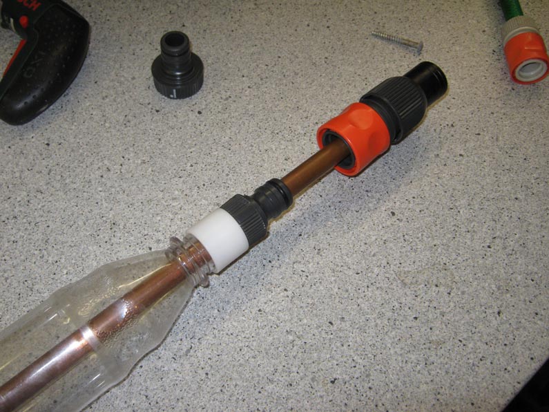 Ein Rohr, das senkrecht in der Gardenakupplung steckt. Bringt nebenbei eine etwas bessere Flughöhe.