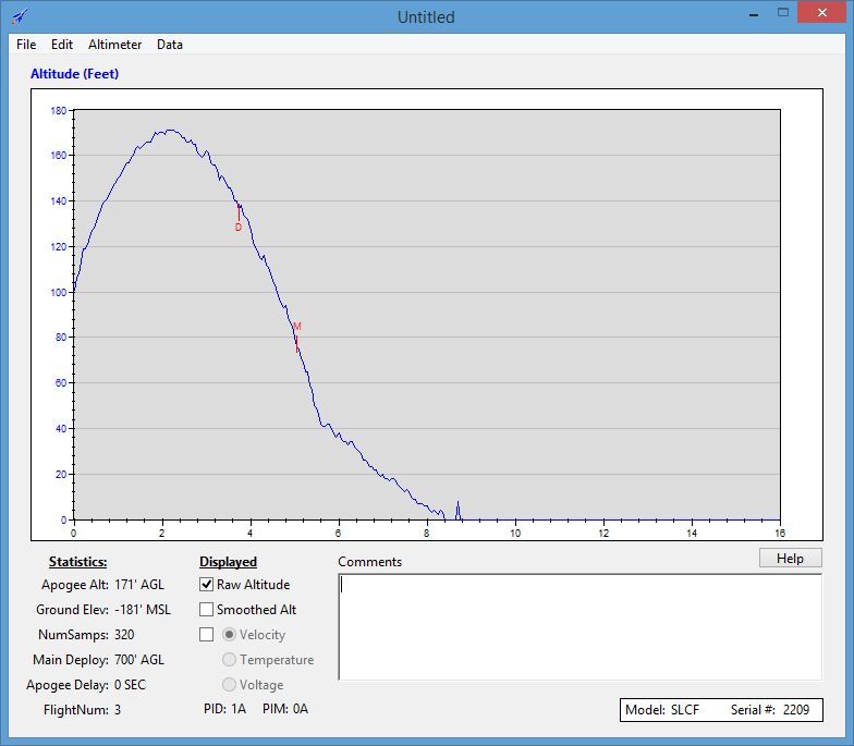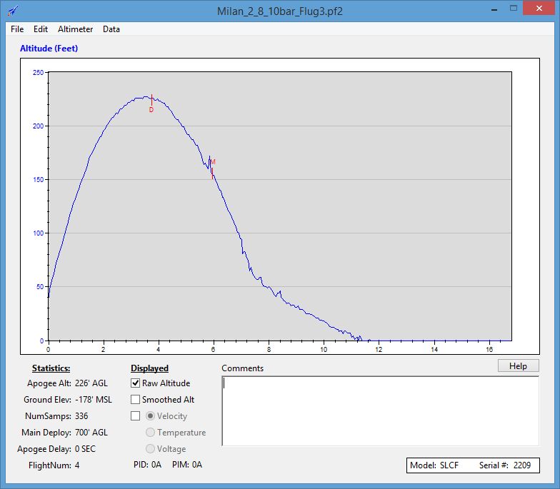 - PerfectFlite Stratologger CF - Altus Metrum MicroPeak verhält. AltiWR gab im ersten Fall die erreichte Höhe mit 52,14 m an: Der Stratologger ermittelte 171 Fuß entsprechend 52,13 m: Der MicroPeak kam auf 52,5 m: Im zweiten Fall gab AltiWR die Höhe mit 68,82 m an: Der Stratologger kam auf 226 Fuß entsprechend 68,90 m: Damit bin ich schon mal sehr zufrieden, denn die Abweichungen sind geringer, als die vom Hersteller angegebene Genauigkeit der Sensoren es erwarten lässt. Natürlich wäre auch ein Vergleich bei größeren Höhen sinnvoll. Tracking https://www.dropbox.com/scl/fo/zap4uvchueg080w0az5og/AOOqAeAiN2aSaAEPhiusKyk?rlkey=cuvsp1db08mrwq20gqqbpicg2&dl=0 Altimeter https://www.dropbox.com/sh/jw1nenfd45mzee3/AABZKjSB-_9DA-pLaVlOti-9a?dl=0 Wer etwas braucht: E-Mail oder PM |