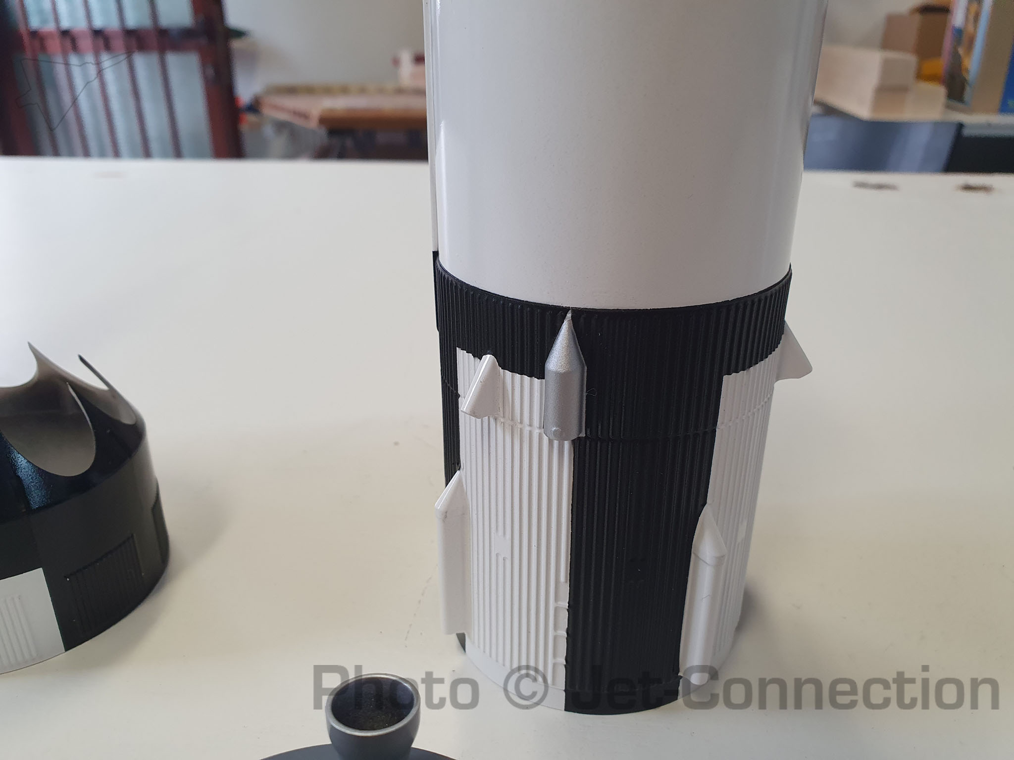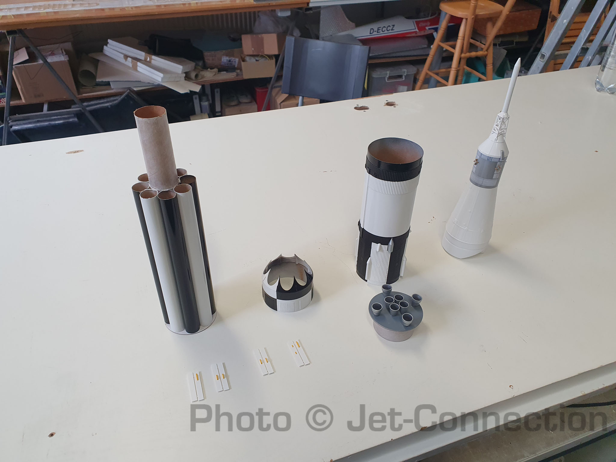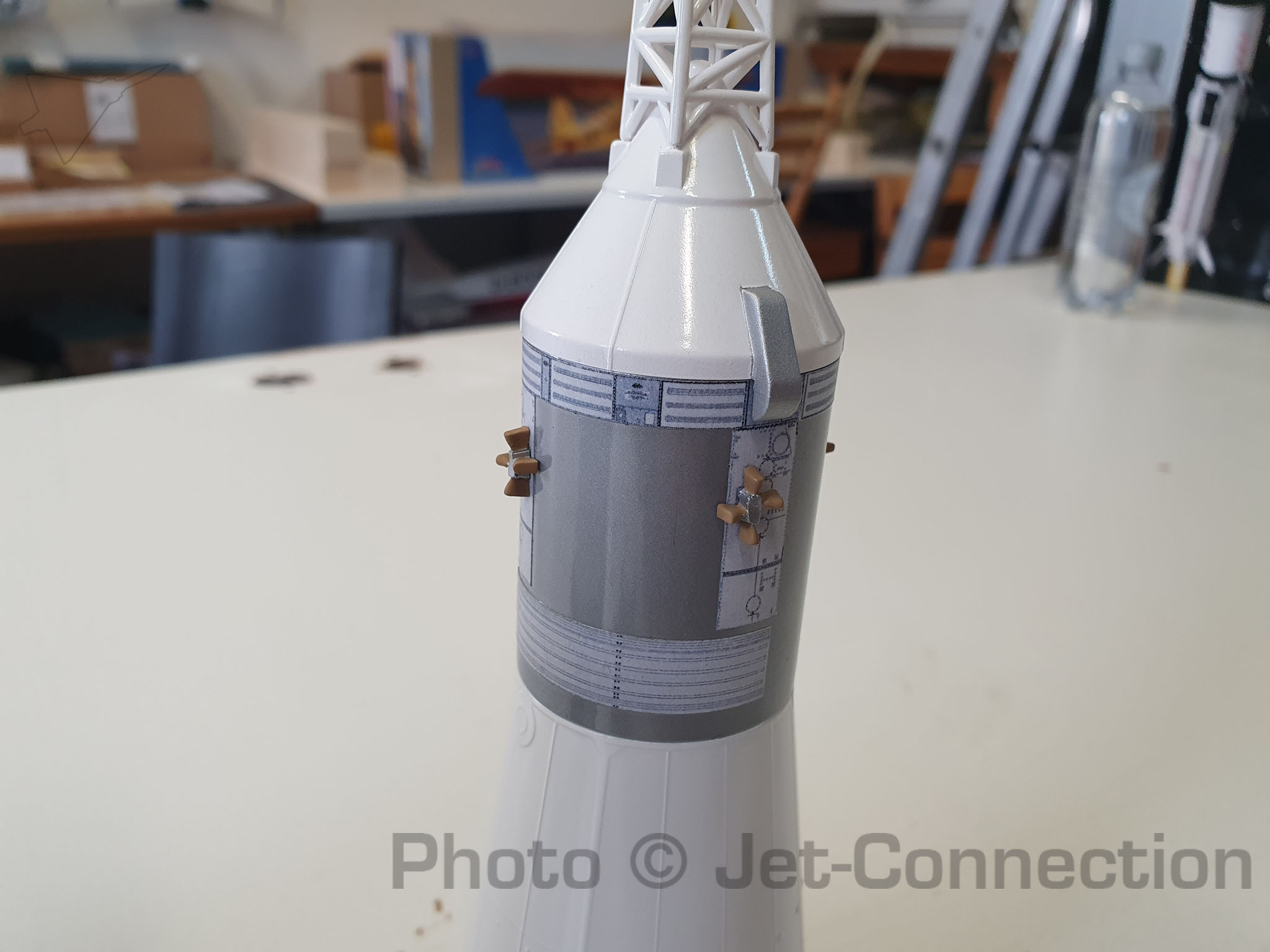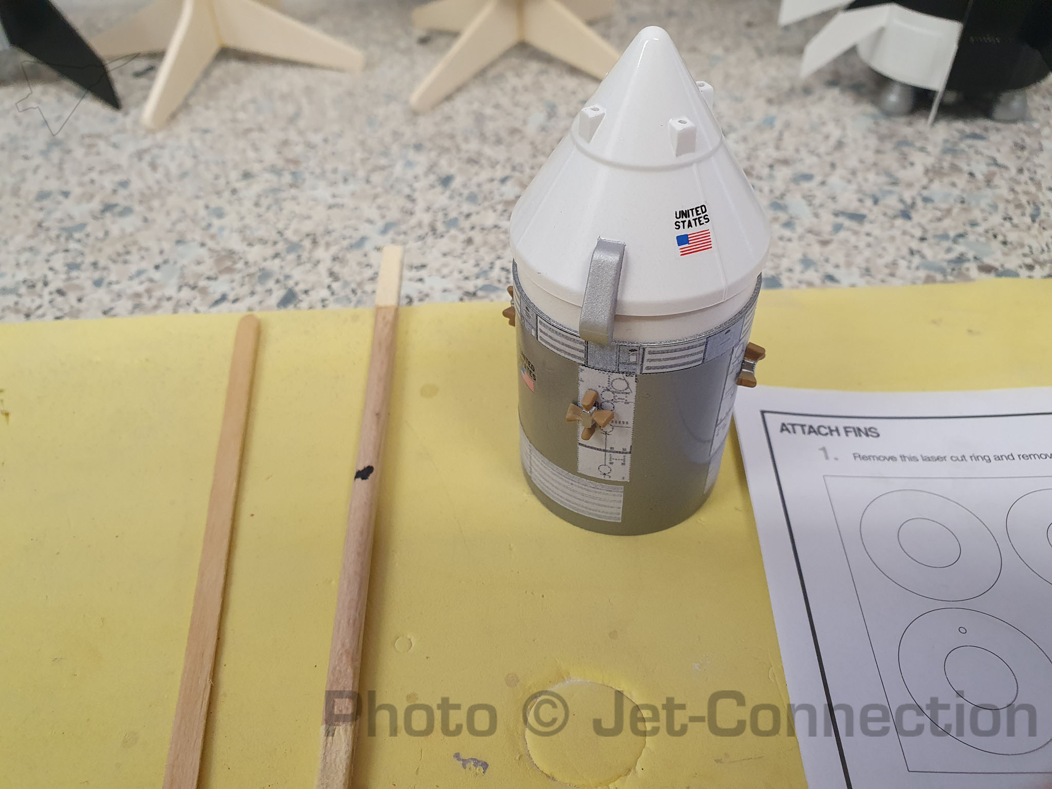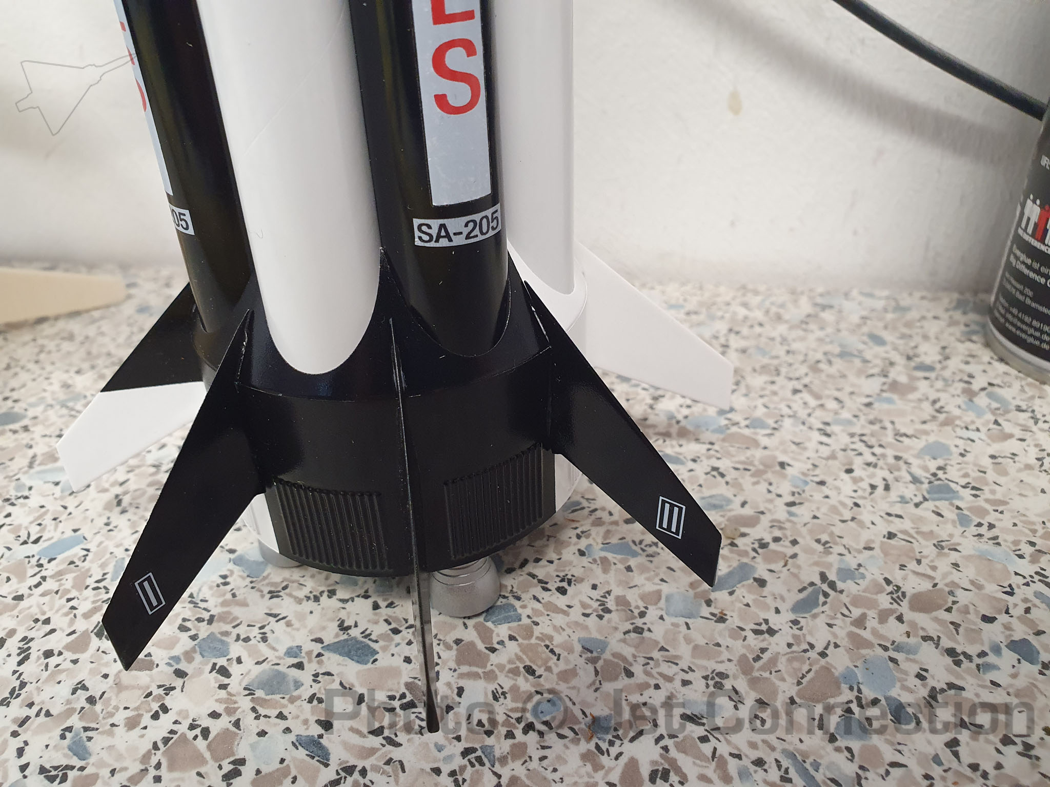 Als nächstes wird noch die Halterung am CSM angebracht für den Fallschirm, die Finnen lackiert und angeklebt und dann kann die Rakete fertiggestellt werden und die Decals aufbegracht. Danach noch eine Schicht Klarlack, auswiegen und auf den Erstflug freuen. A propos auswiegen: Kann mir irgendwer sagen wie schwer die Grains für das Aerotech 24/40 Casing sind?