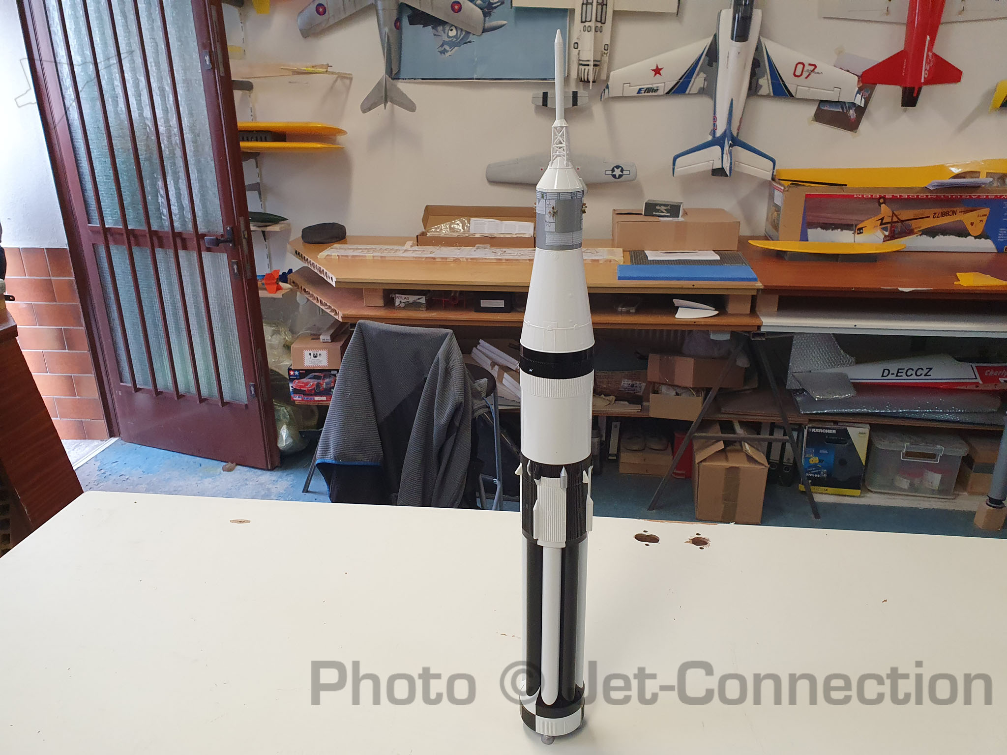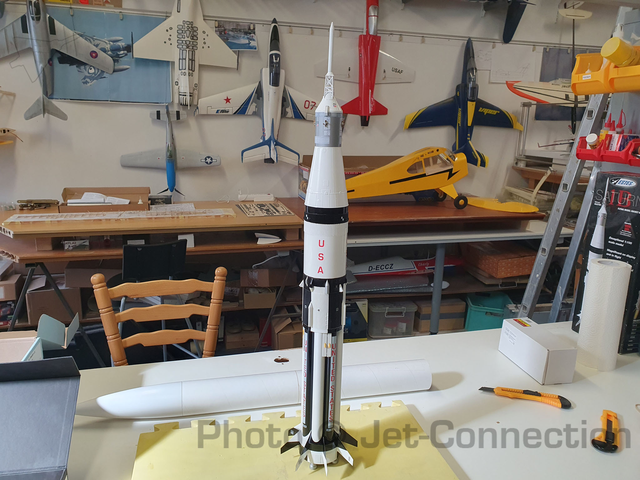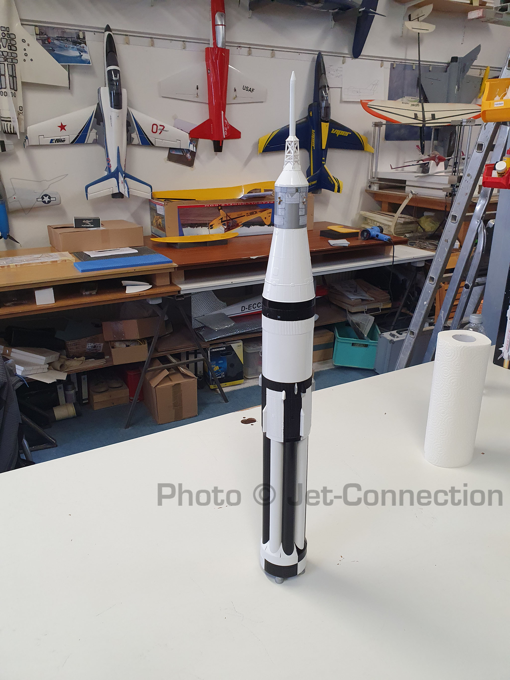 Der Vollständigkeit halber: Die Saturn 1b ist jetzt mit kleinen Fehlerchen fertig und ausgewogen. Das Abfluggewicht liegt mit einem Aerotech 24/40 Casing inklusive 30g Gewicht (das schwerste was ich in der Übersicht finden konnte was sinnig ist zum fliegen) 261,9 Gramm.