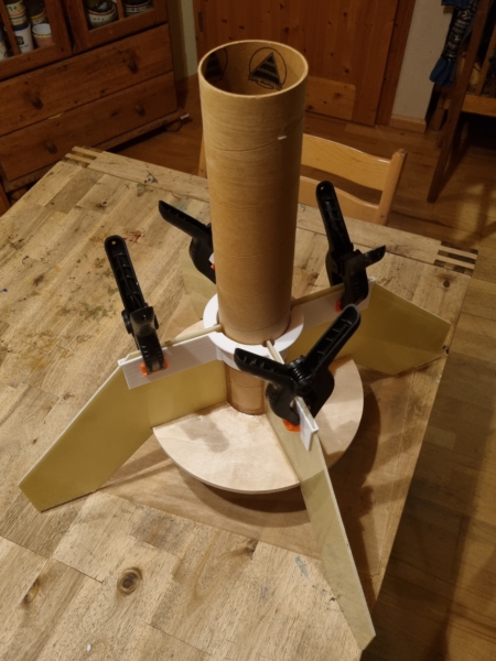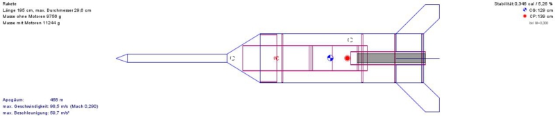 Hi Andreas, Das ist eine spannende Frage... Im Openrocket komm ich mit 1,5 kg auf eine Stabilität von 0,35 cal / 5,26 %. Mit dem Basdrag-Hack sieht es ohne Gewicht schon gut aus, aber den wollte ich Mangels Nachvollziehbarkeit nicht mehr nutzen. Im Rocksim mit den "Rocksim equations" komm ich ganz ohne Gewicht auf eine vergleichbare Stabilität, ebenfalls ohne Basdrag-Hack, 0,34 cal. Die Spitze ist nur "Deko", macht in beiden Simulation auch kaum was aus. Aber jetzt mal abwarten wo die Rakete mit Gewicht und Schwerpunkt am Ende "landet", anbei die aktuell gültige Konstruktion. Viele Grüße, Matthias