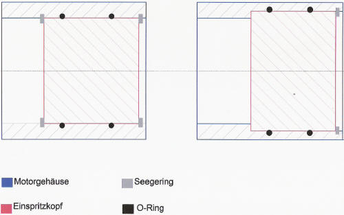 Wieso benutzt Du für den Einspritzkopf nicht auch einfach einen Sprengring? Wie hast Du Dir die Schraubverbindungen zur Befestigung vorgestellt? Einfach Loch im Gehäuse und Gewinde im Kopf? Halte ich für ungünstig, bei solchen Scherbeanspruchungen solltest Du auf jeden Fall Bolzen verwenden.