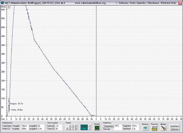 Hier die Daten eines Fluges mit einem AT I366, die Rakete ging dann noch auf 740m, Zeitindex 12.6 sec. Eine Auslösung, wie vom SALT detektiert, bei 2.4 Sekunden wäre also definitiv zu früh gewesen.: ******************************************************************** Höhe Flugzeit Geschwindigkeit ******************************************************************** 0 m | 0.0 s | 0 m/s 2 m | 0.2 s | 10 m/s 4 m | 0.4 s | 10 m/s 11.9 m | 0.6 s | 25 m/s 15.9 m | 0.8 s | 30 m/s 19.8 m | 1.0 s | 20 m/s 25.8 m | 1.2 s | 25 m/s 29.8 m | 1.4 s | 25 m/s 45.7 m | 1.6 s | 50 m/s 57.6 m | 1.8 s | 70 m/s 101.6 m | 2 s | 140 m/s 75.6 m | 2.2 s | 45 m/s 35.7 m | 2.4 s | -165 m/s ----------------------------------------------------------------------------- EREIGNIS: Gipfelpunktsauslösung 2.4 s ----------------------------------------------------------------------------- ----------------------------------------------------------------------------- EREIGNIS: Mindesthöhe 2.4 s ----------------------------------------------------------------------------- 81.6 m | 2.6 s | 15 m/s 113.6 m | 2.8 s | 195 m/s 141.7 m | 3 s | 150 m/s 171.9 m | 3.2 s | 146 m/s 204.2 m | 3.4 s | 156 m/s