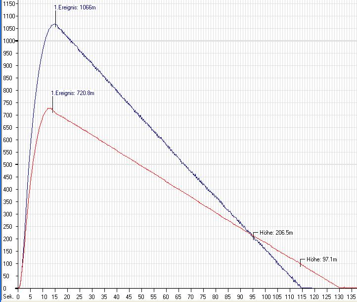 Dies ist eine reichlich absurde Diskussion. Nach dem Motto "Wenn die Leute keine Probleme haben, dann basteln wir uns welche" sind wir jetzt schon an dem Punkt angekommen, wo sich jemand glaubt zu erinnern, daß er mal vor Jahren gelesen haben könnte, daß barometrische Höhenmesser für Raketen ungeeignet sind. Der nächste faselt was von Schallmauern, davon was der Beschleunigungssensor nicht könnte, und von Elektronik zwischen Zangen und Schraubenziehern. Nicht ohne jedesmal hinzuzufügen "hier haben wir es aber mit anderen Problemen zu tun". Na klar, mit eingebildeten! In der profanen Wirklichkeit hat der SALT schätzungsweise viele Hundert Flüge perfekt begleitet und eine sichere Bergung gewährleistet. Das trifft übrigens auch, man sollte sich gelegentlich dran erinnern, auf den vorliegenden Hybrid-Flug zu. Wie man aus den Kurven auf Seite 1 entnehmen kann, sind beide Raketen wohlbehalten gelandet. Die Fragen waren ursprünglich, woher der linke Zacken am Gipfelpunkt kommt, und woher die eine Fehlmessung beim Aufstieg in der rechten Kurve. Ich habe eine relativ große Sammlung von Flugdaten, weil die Leute immer wieder zu mir kamen um ihre Daten auslesen zu lassen. Wenn ich diesen Datenbestand durchsehe, dann sind fast alle Kurven so beschaffen wie die beiden folgenden, nämlich stetig und ohne nennenswerte Ausreißer. Allerdings sieht man der einen Kurve an, daß der Abstieg unruhiger verlief- kein Wunder, die Rakete pendelte heftig am Fallschirm. Sogar das registriert der SALT- finde ich prima. Die andere Kurve ist recht glatt, hier schwebte die Rakete bei fast Windstille sachte herunter: