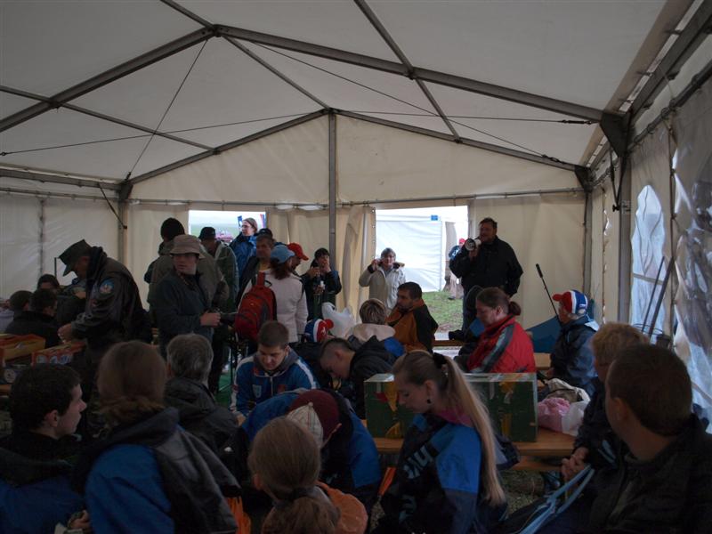 Teilnehmer im Vorbereitungszelt, der Wettbewerbsleiter macht eine Durchsage