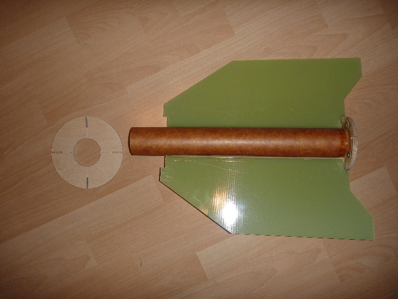 Die Motor/Leitwerkhalterung: Die gefrästen Flossen müssen nur noch minimal bearbeitet werden, damit sie in die Nuten der Spanten passen: Auf das Motorrohr wird der Schubspant geklebt. Für das Motor-Retainment sind 4 Einschlagmuttern eingeklebt: Die ersten beiden Flossen sind auf das Motorrohr geklebt:  Viele Grüße Dennis