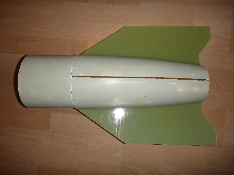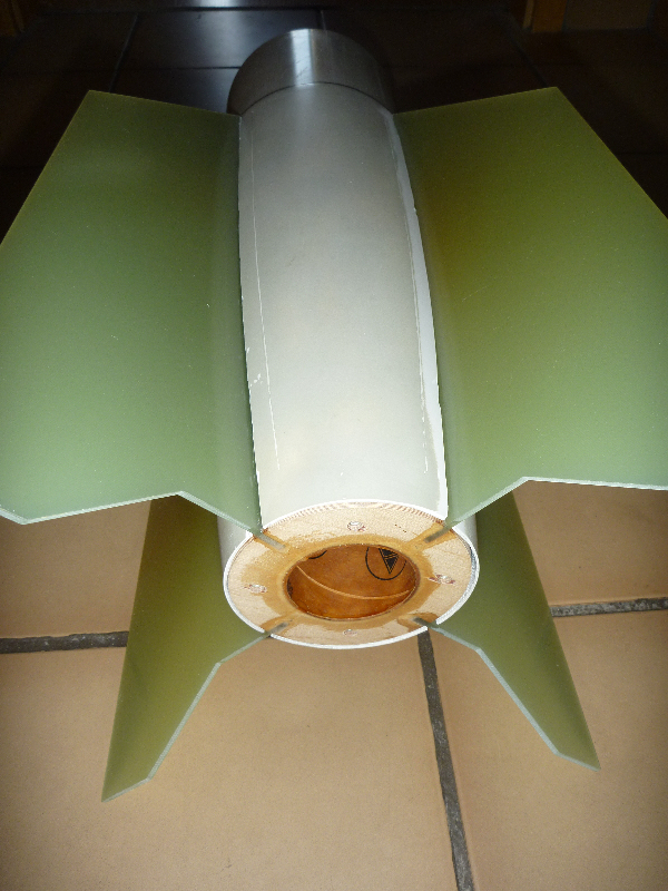 Die letzte Flosse kann auf das Motorrohr geklebt werden: Soweit das Heck. Jetzt steht an die Verbindung der Flossen zum Motorrohr weiter zu verstärken und Feilen/Scheifen bis alles schön passt... Viele Grüße Dennis
