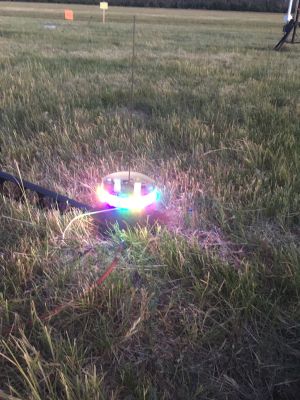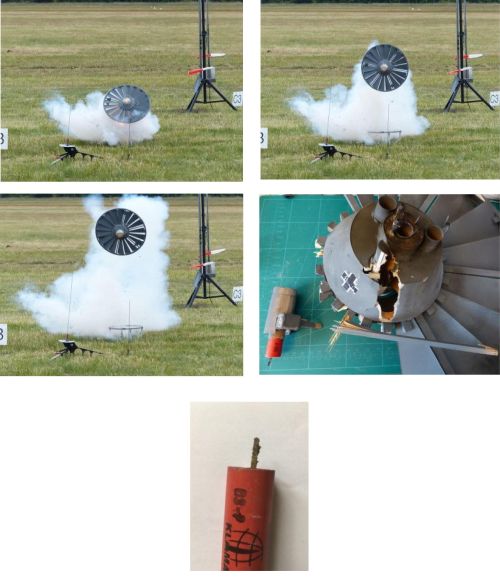 Der Start meines Modells von "Schrievers Kreisel" hat leider zum Crash geführt. Nach der Zündung platzte einer der drei ringförmig angeordneten Treibermotoren (viertes Bild). Dadurch überschlug sich das Modell (Bilder 1 bis 3), kam hart auf den Boden auf und zersprang in mehrere Teile (Bild 4). Die Motoraufhängung eines der drei für die Rotation verantwortlichen D3-Motoren löste sich, flog noch ca. 20 m weiter (Langbrenner), und der Motor brannte in die Seitenwand von Charlys Shelter ein Loch.
