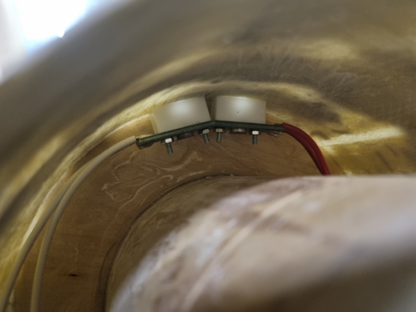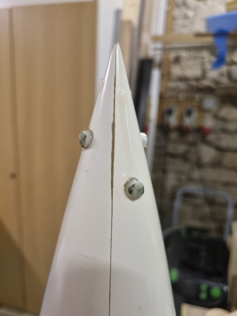Hallo zusammen, bin gerade an Spitze und E-Bay. Der Spitze selbst habe ich nochmals 160 gr Faser spendiert. Das hat schon besser geklappt, aber hält.  Heute morgen habe ich fürs erste 500 gr Blei in die Spitze gegossen und eine Gewindestange eingebracht, welche später mit dem vorderen Spant der Spitze zusammen den Ankerpunkt für die Leine verbindet. Das Hölzchen dient nur der sicheren Ausrichtung. Für eine sichere Verbindung habe ich vorab 2 GFK-Dübele quer eingeklebt. Viele Grüße, Matthias