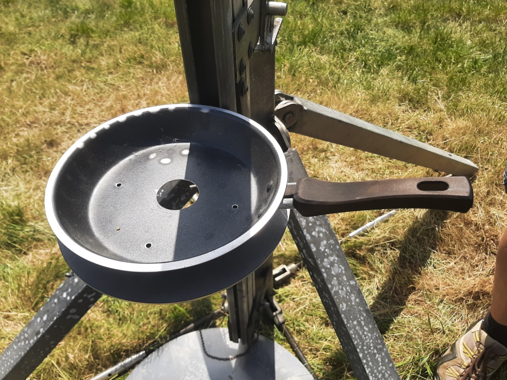 Darauf kommt dann die bereits bewährte klassische offene Zünd (Brat)-Pfanne... diese wird ebenfalls fest verschraubt, Alles fertig montiert. das Loch in der Mitte dient zur Druckentlastung bei der Zündung... Die startbereite MEDUSA 2 aufgesetzt, passt alles... !Geändert von Andreas B. am 21. Mai 2024 um 22:59 |