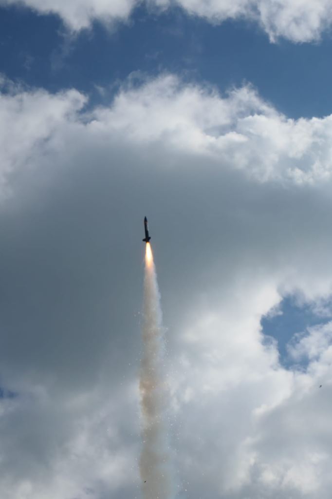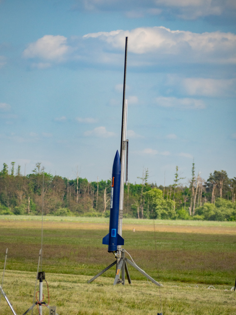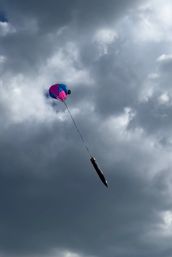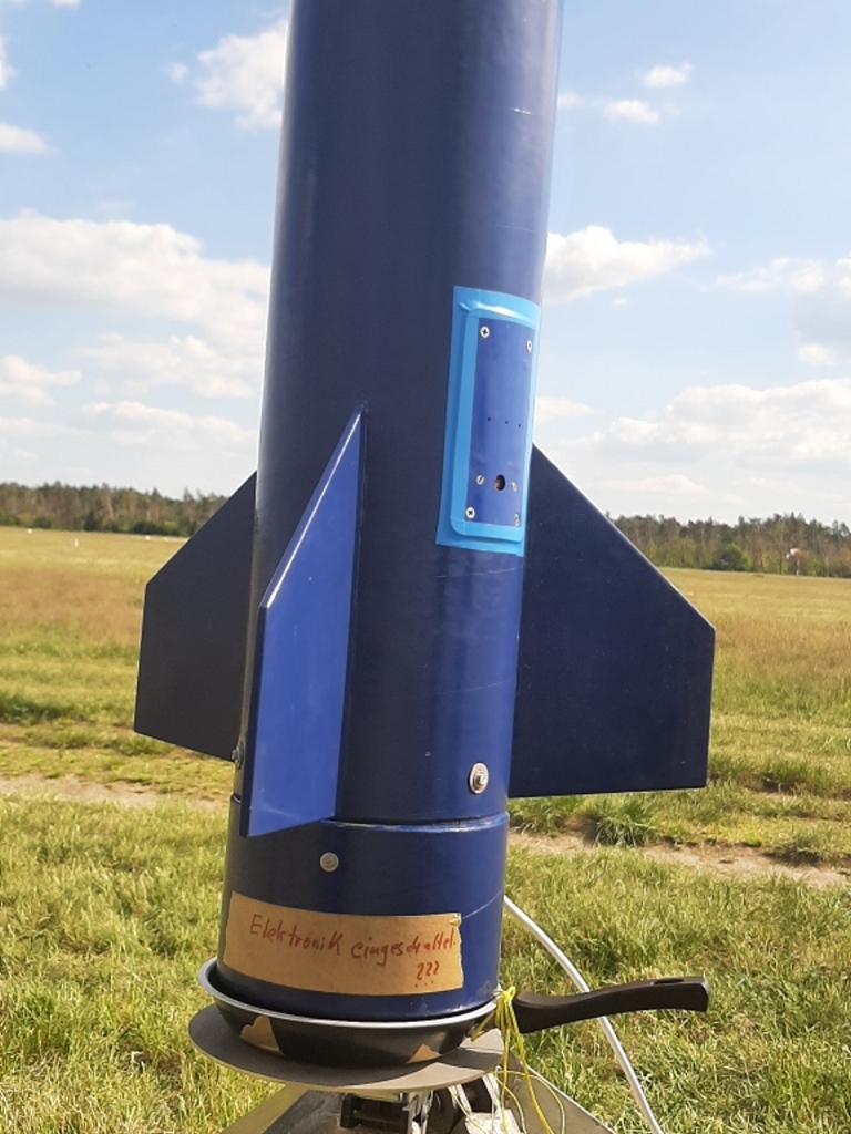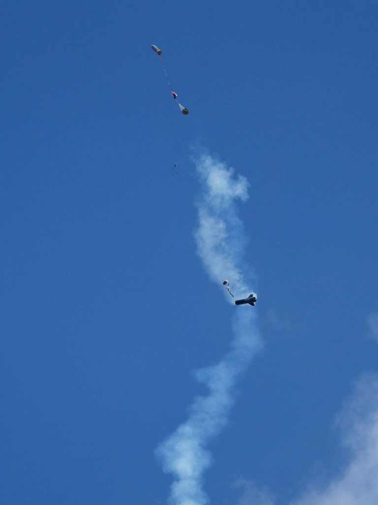 und schieben... und dank Altimax, genau am Gipfel die Trennung... Die Landung wie geplant in zwei Teilen.. Leider ist mir mir beim Fallschirm packen ein kleiner Fehler unterlaufen (habe das Feuerschutztuch nicht fest genung an der Schockleine befestigt, so das sich dieses beim Heckteil mit den Fallschirmleinen verhäddert hatte, was dazu führte das sich der Fallschirm nicht richtig öffnen konnte.... So setzte die Hecksektion etwas härter auf und wurde oberhalb einer Flosse leicht beschädigt... (ist aber zum Glück leicht reparabel) |