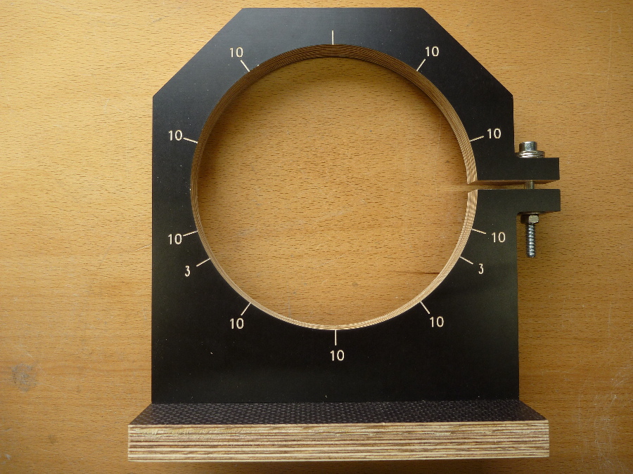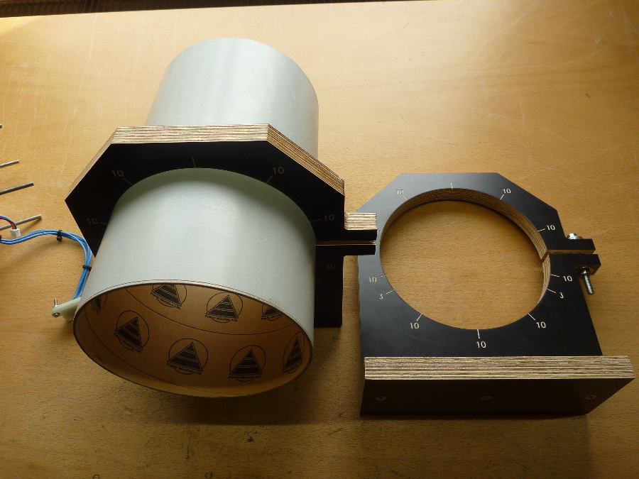 ![]() Für den Umbau der großen A4 muss die Ebay mit dem oberen Rohrteil verschraubt werden. Um die 10 Bohrungen auch möglichst genau zu platzieren, habe ich mir heute diese Ausrichthilfen gebaut. Fix gezeichnet und die Fräse angeworfen. Die Rohre werden gemeinsam geklemmt, markiert, gebohrt. Dann wird immer bis zur nächsten Markierung weiter gedreht, geklemmt, gebohrt usw. Ich werde später die Gravuren noch um die Teilungen 2 bis 9 ergänzen. Heute nur das nötigste (3er-Teilung für die Shearpins). |