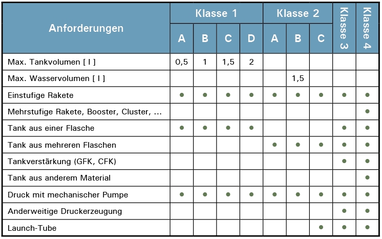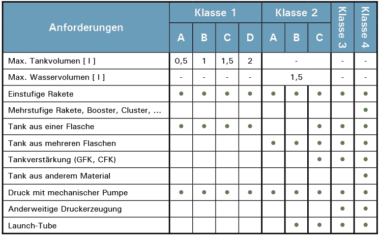 1. Die Klassen - nicht die Unterklassen der Ein-Flaschenraketen - sollen in ansteigenden Aufwand und Schwierigkeitsgrad aufeinander aufbauen.