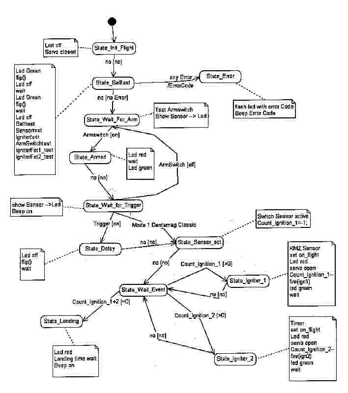 Zitat: Das Problem ist Möglichkeiten etwas zu realisieren bestehen fast immer, für mich stellt sich nur die Frage wie soll ich das in der Software "verwalten" o. "einstellen". Ich hab mich jetzt auf verschieden Betriebsarten( Modi-Nr.) festgelegt, da ist dann die Reihenfolge der Abläufe festgelegt, d.h. wann welcher Timer o. anderes Event welches Event auslösen soll. Könntest Du deinen Ablauf mal darstellen, so in etwa: 1. Trigger-Kontakt hat ausgelöst 2. Timer1 und Delay Timer läuft an 3. Ablauf Delay-Timer Magnetfeldsensor wird scharf geschaltet 4. Timer1 läuft ab --> Zündkanal 2 zündet 5. Magnetfeldsensor schaltet -->Zündkanal 1 zündet 6. Beide gezündet ? Timer2 läuft an 7. Timer2 abgelaufen --> Servo in open Stellung fahren Ich habe die Abläufe als State-Maschine im Microcontroller gelöst das sieht dann in etwa so aus: Die Frage ob man den "neusten" PC hat, beantwortet man sich, wenn man links neben der SPACE-Taste schaut !!!! |