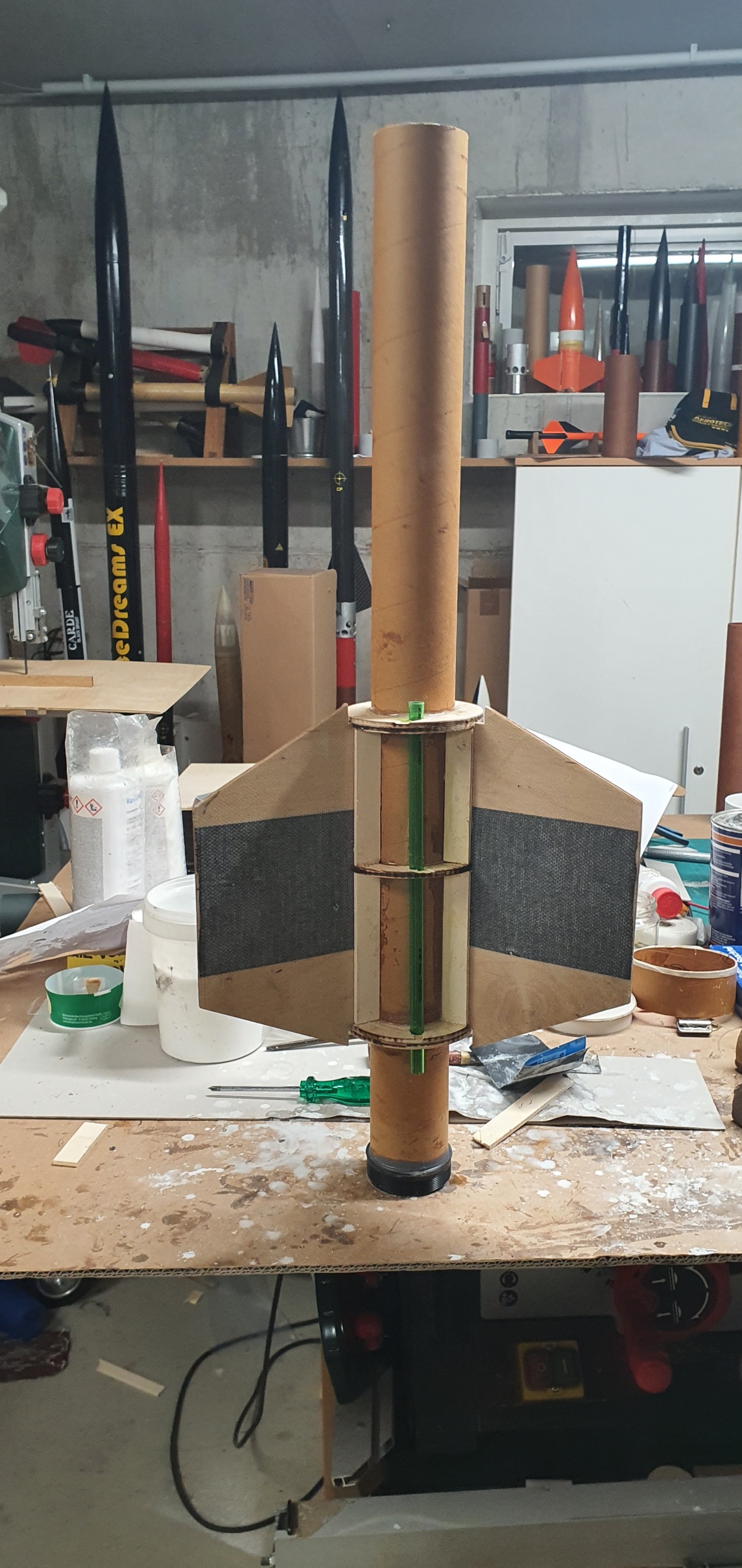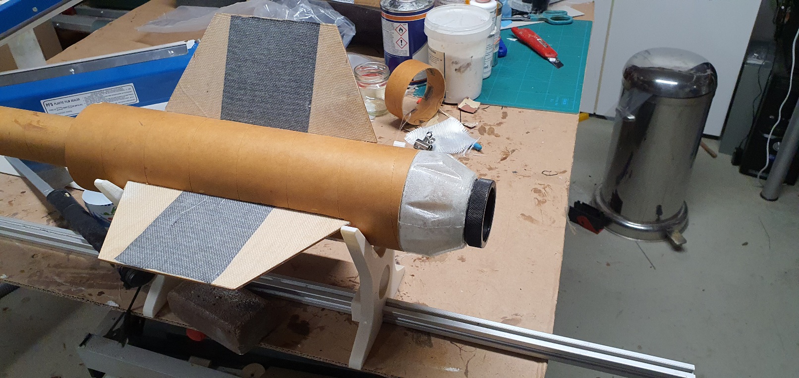Das Motorrohr und die Spanten sind jetzt mit Sperrholz verkastet. Das soll verhindern, daß das Epoxy beim Verklenen weglaufen kann. Wenn man wollte, könnte man abnehmbare Flossen bauen.