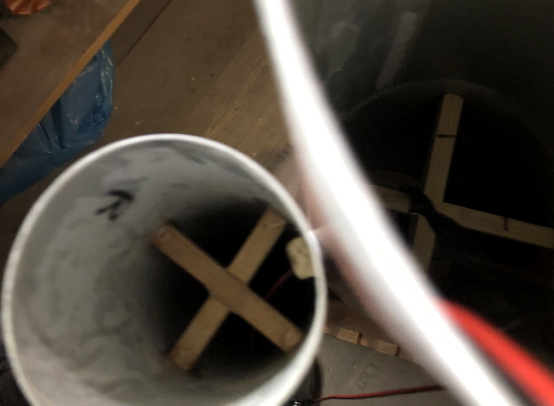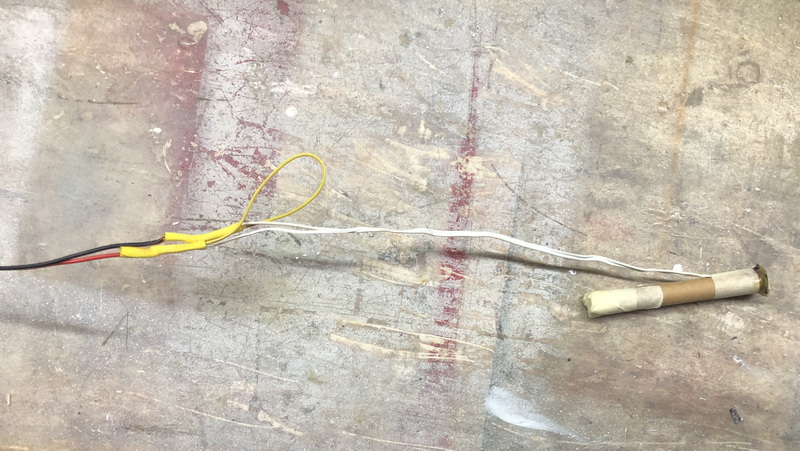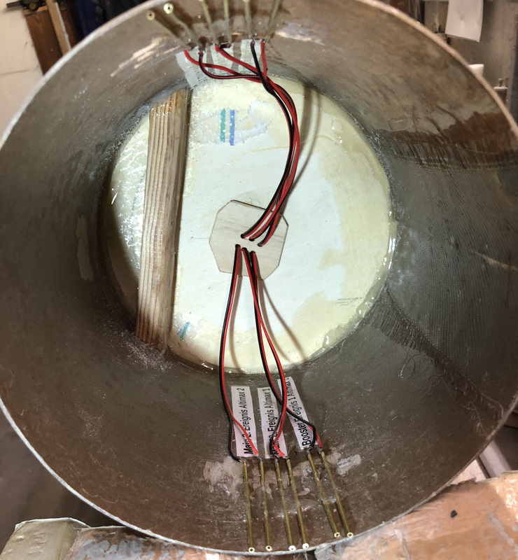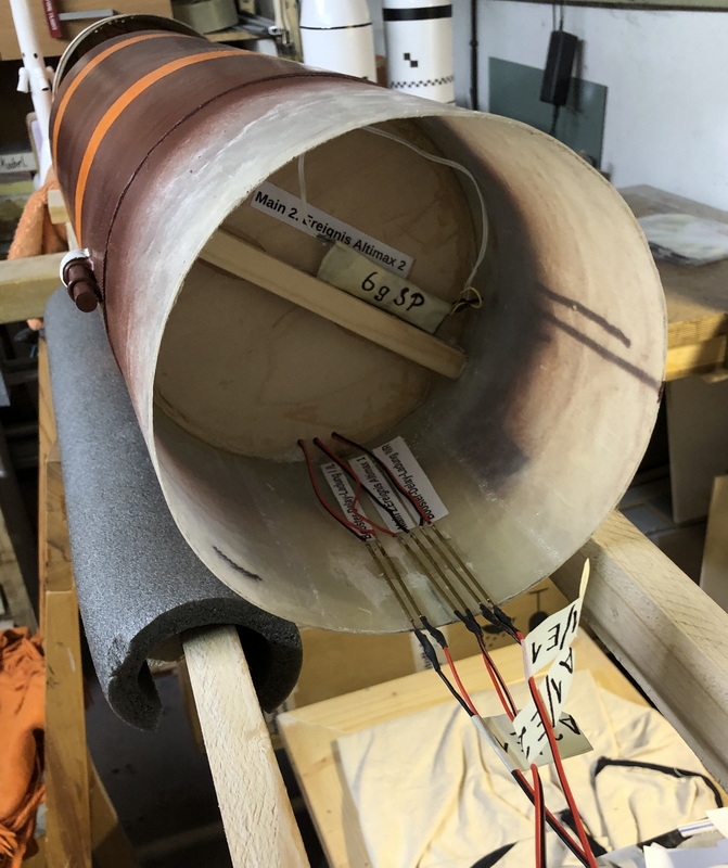 Um die elektrische Verkabelung zu den Ausstoßladungen zu installieren, musste ich mir eine Art Laffette bauen, um die Raketenteile hintereinander ablegen zu können. So werden wir es am Starttag beim Preppvorgang auch machen.