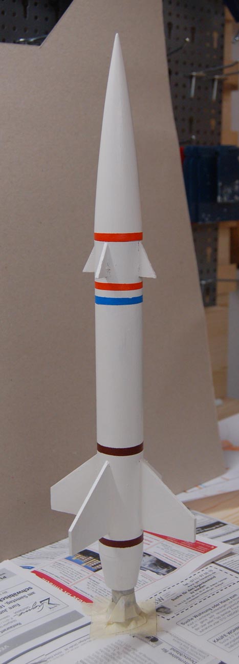 Beim letzten Flug in Manching hat sich herausgestellt, dass die Estes Bullpup mit der geringen Menge Zusatzgewicht in der Nase nicht stabil fliegt. Laut OpenRocket brauchte sie etwa 18 g mehr um mit einem C6 stabil zu fliegen, die habe ich in Form von Blei und Epoxy eingegossen.