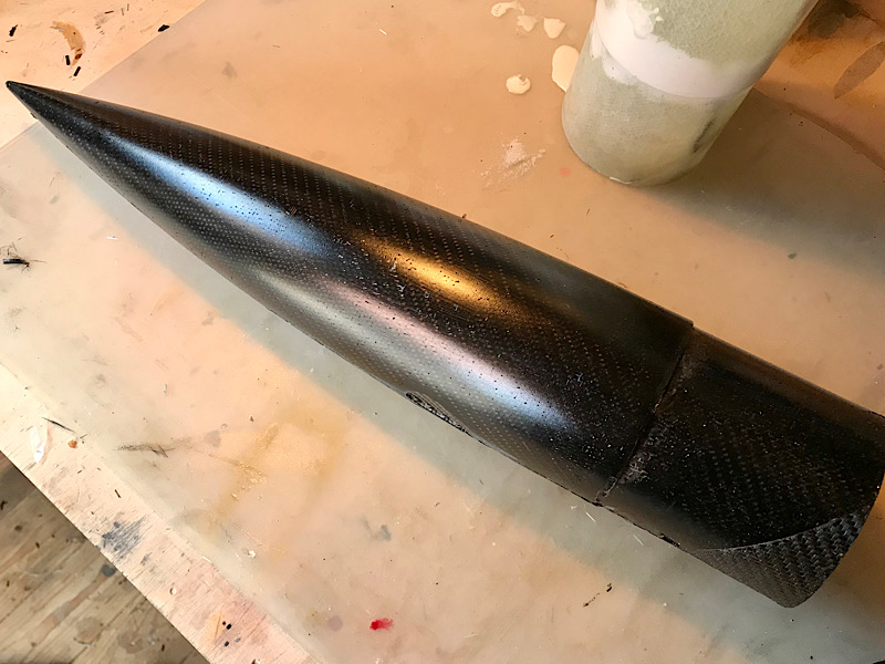 Nächster Versuch in Carbon Andreas, das ist Deine. Für die Form. Form vorgestrichen mit angedicktem, leicht eingefärbtem Harz, 1x Carbon ?g/m², Köper SpreadTow, als Finish 1x Carbon 100g/m² Biagonalgelege 45°/45° als Unterbau Im Kuppler noch eine Lage irgendein Rest zur Verstärkung. Schulter, Nahtstellen und Spitze mit mit Glasballons angedickter und tiefschwarz gefärbter Matsche gefüllt. An der Längsnaht überlappt das Unterbaugewebe etwa 2cm, Spitze mit Faser- und Microballon-Matsche vollgedrückt. 200g, sauberes Finish. So kann das weitergehen. Jan