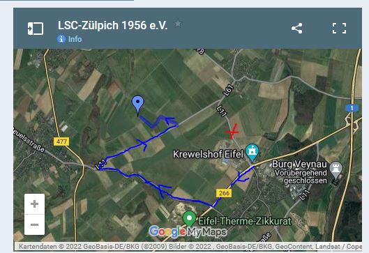 auf der Website LSC Zülpich kann man auch die allgemeinen Daten unter Anfahrt, der Weg am Krewelshof vorbei (s. Bildausschnitt) war aber vor ein paar Wo noch gesperrt (rotes Kreuz), daher bitte der blauen Linie folgen und hintenrum den Feldweg anfahren.